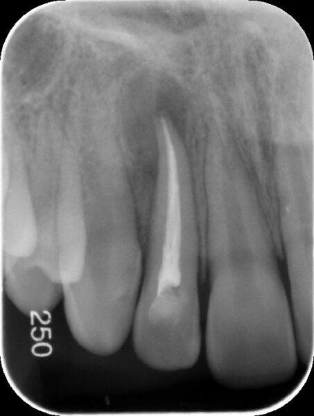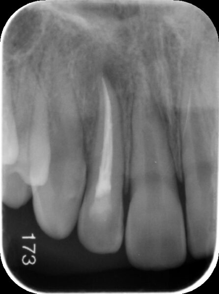 この症例は若年者のため根が完成していない根未完成歯の根管治療です。基本的に10代初めのころではこのように根が完成していないことが多いのですが、根管治療の不備や治療の遅れで、根が短いまま歯が完成されることもあります。根が短いことで将来的に歯周病などで歯が揺れてきたり、歯が割れやすくなることがあります。今回は根尖部分にだけMTAセメントを用いて歯の再生を促すような治療を行いました。(上部にはガッタパーチャという根管充填材を使用しています。)