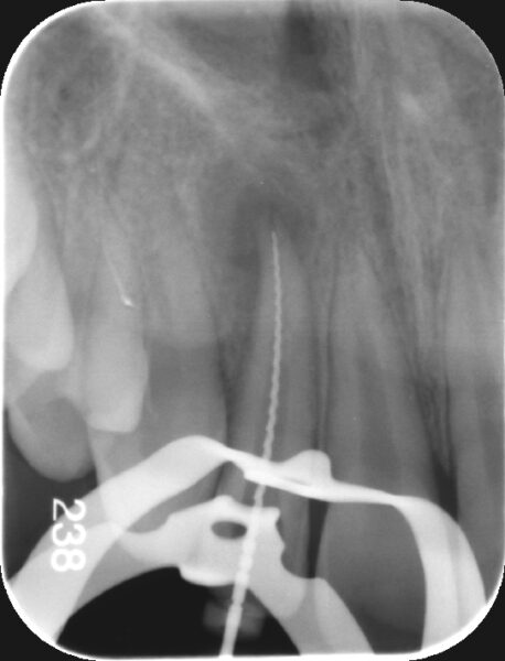 根の先端を確かめるためのレントゲンです。レントゲン上では実際の根の先端より手前側に根の先端があることが確認されます。