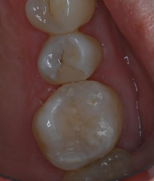①では咬合力に耐えられる強度が不足していることと着色が付きやすいことが懸念されるためおすすめはしませんでした。もう少し銀歯が小さければ、保険用コンポジットレジンでも十分修復できると思われます。②、④、⑤は間接法と呼ばれ、型取りが必要な方法になります。ここで問題になってくるのは、切削量の増加です。どうしても型取りする場合は少し大きめに削らないといけないのが現状です。ご自身の歯を出来る限り削りたくないとのことで、これもまたおすすめしませんでした。(銀歯の範囲が大きければ、ダイレクトボンディング法を選択できないため、間接法を選択することをおすすめします。)よって歯を出来る限り削らず、強度を増加させ修復させるために③のダイレクトボンディング法を選択しました。